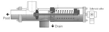 The automatic backwash valve is opened by water pressure and dosed by the pressure of a an actuator. In the event of a power outage or other problem, the Besgo valve automatically switches itself to filter mode and prevents the pool from being drained unintentionally.